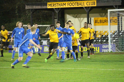 Merstham’s tails were up and they went three ahead just past the half-hour mark following a dreadful decision by the referee. Nat Lofthouse would have been proud to seen Emmanuel Omlore bundle Mitchell into the goal as the keeper looked to collect a corner but the referee somehow saw it as a fair challenge.